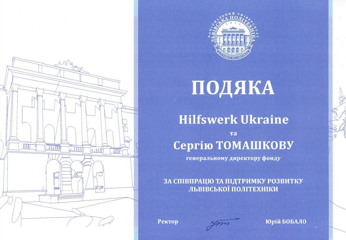 Wir freuen uns sehr über die Anerkennung unserer Aktivitäten vor Ort durch die Polytechnische Universität Lviv. Am 11. Dezember 2024 hat der Akademische Rat das Hilfswerk Ukraine einstimmig zum „Gönner des Jahres der Polytechnischen Universität Lviv“ ernannt.