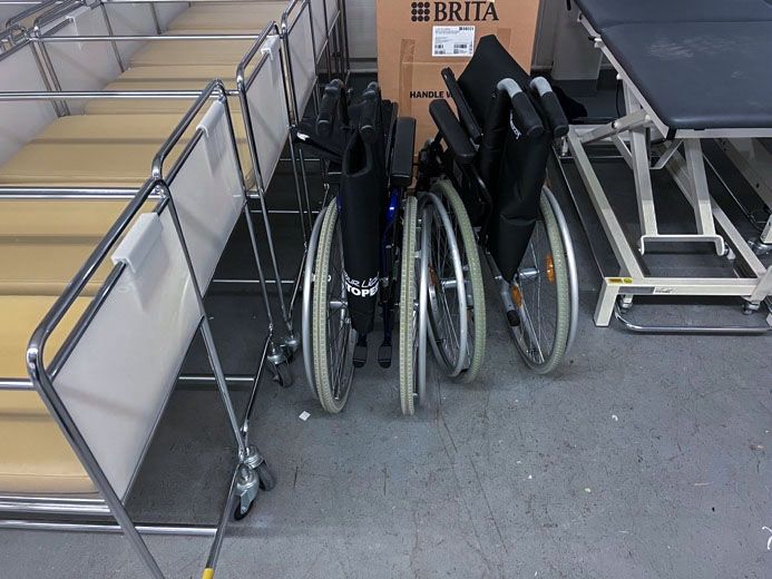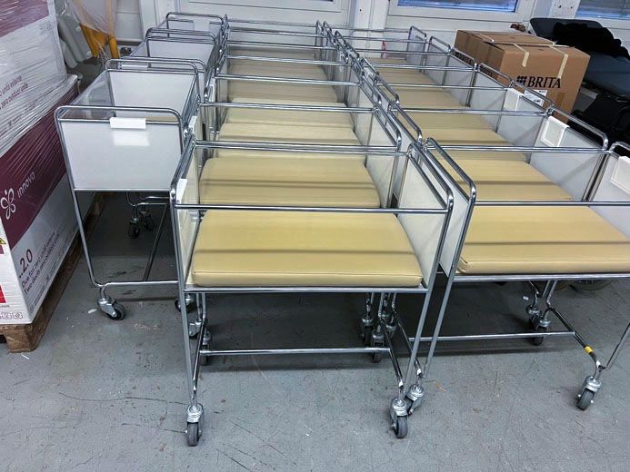 Baby-Spitalbetten und Rollstühle für die Ukraine.
