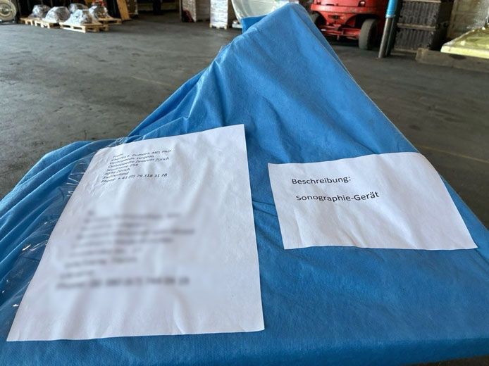 Eingepacktes und adressiertes Sonographie-Gerät.